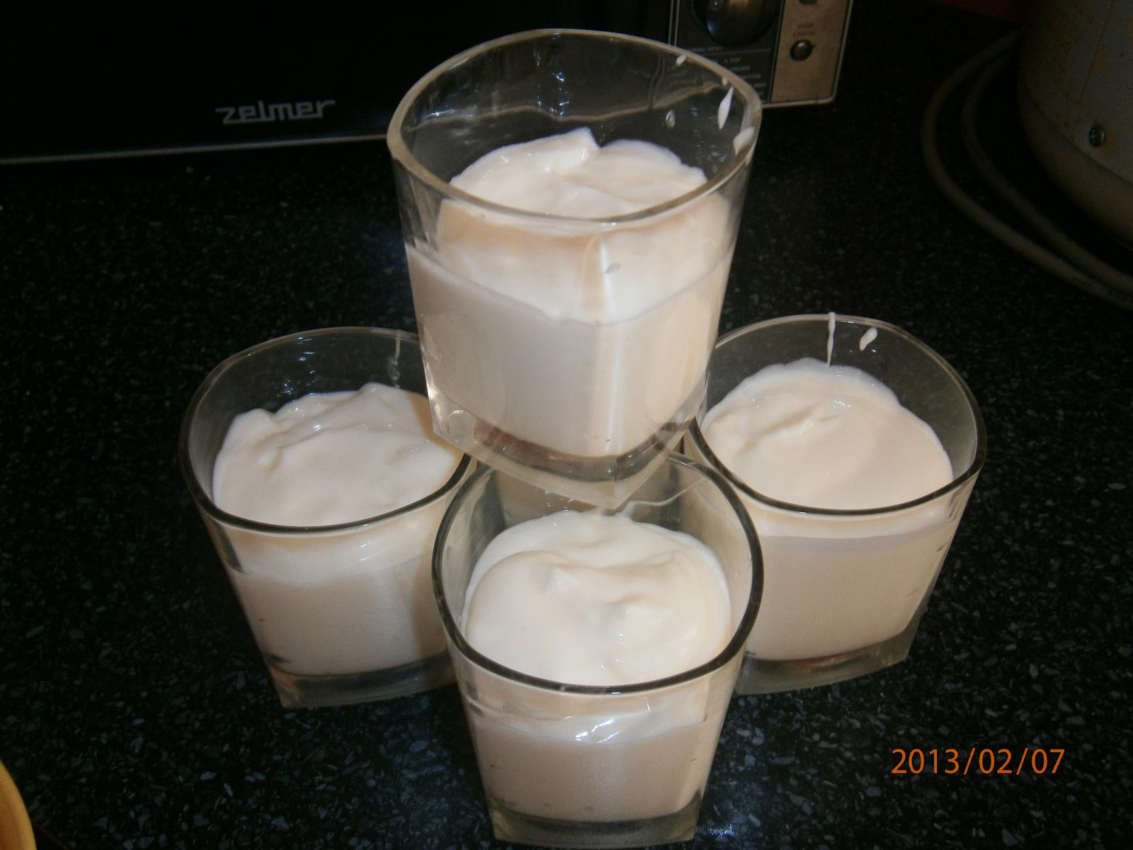 z 300ml mlieka som si uvarila vanilkový puding, do ešte horúceho som dala asi 2cm pásik masla, miešala som puding až kým nevychladol, pridala som 3 vanilkové cukre, 3 PL práškového cukru, 1 jemný tvaroh (250g) a 2 biele (alebo vanilkové) jogurty. Všetko som vymiešala do hladka, dala som to do pohárov a do chladničky stuhnúť 🙂 cukor si každý môže prispôsobiť podľa seba ako má rád 🙂