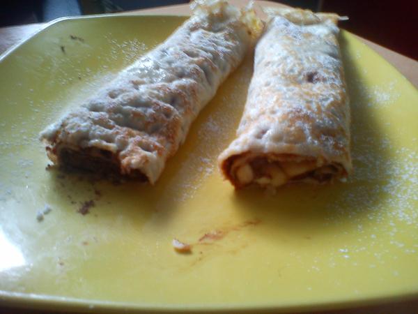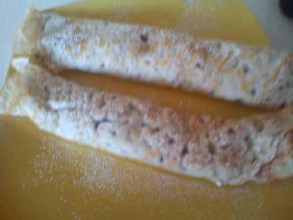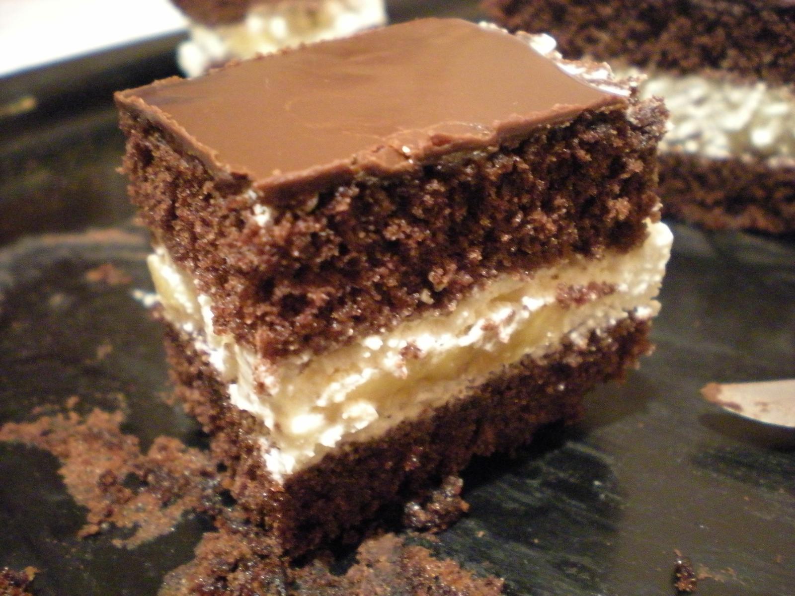 Polovicu šľahačky natrieme na plát, poukladáme kolieska banánu a natrieme zvyšnú šľahačku. Prikryjeme druhou polovicou plátu a na vrch dáme tenkú vrstvu čokoládovej polevy.
