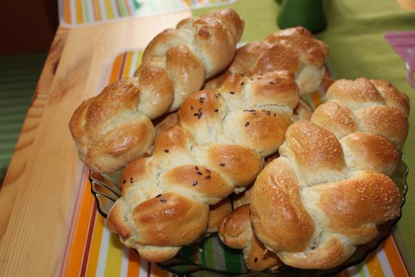 Vymiesime cesto, necháme hodinu kysnúť, vytvarujeme žemle, nožom spravíme zárez na vrchu, necháme na plechu 30 min. ešte podkysnúť. Potom potrieme vajíčkom, posypeme semienkami /ja som nemala/, dáme piecť do vyhriatej rúry tak ako chlieb na 200´C cca 40 min.