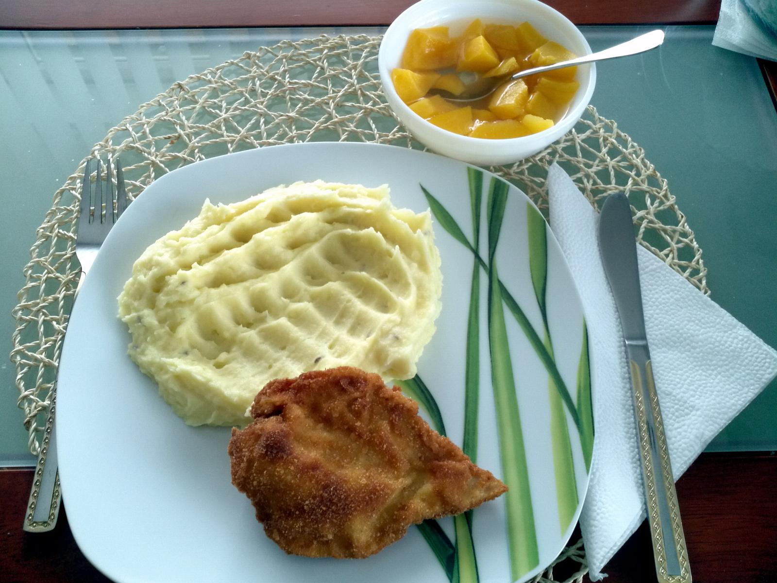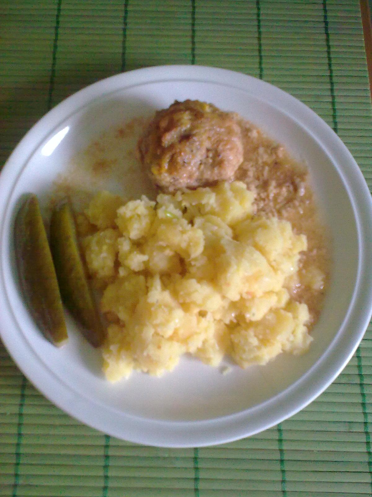 Druhá varianta je so zemiakovou kašou. Môžeme dorobiť na chuť ešte šampionovú omáčku (šampiony a cibuľku opražiť, pridať črievkový syr, podliať troškou smotany, osoliť jemne a chvíločku povariť) hotovo