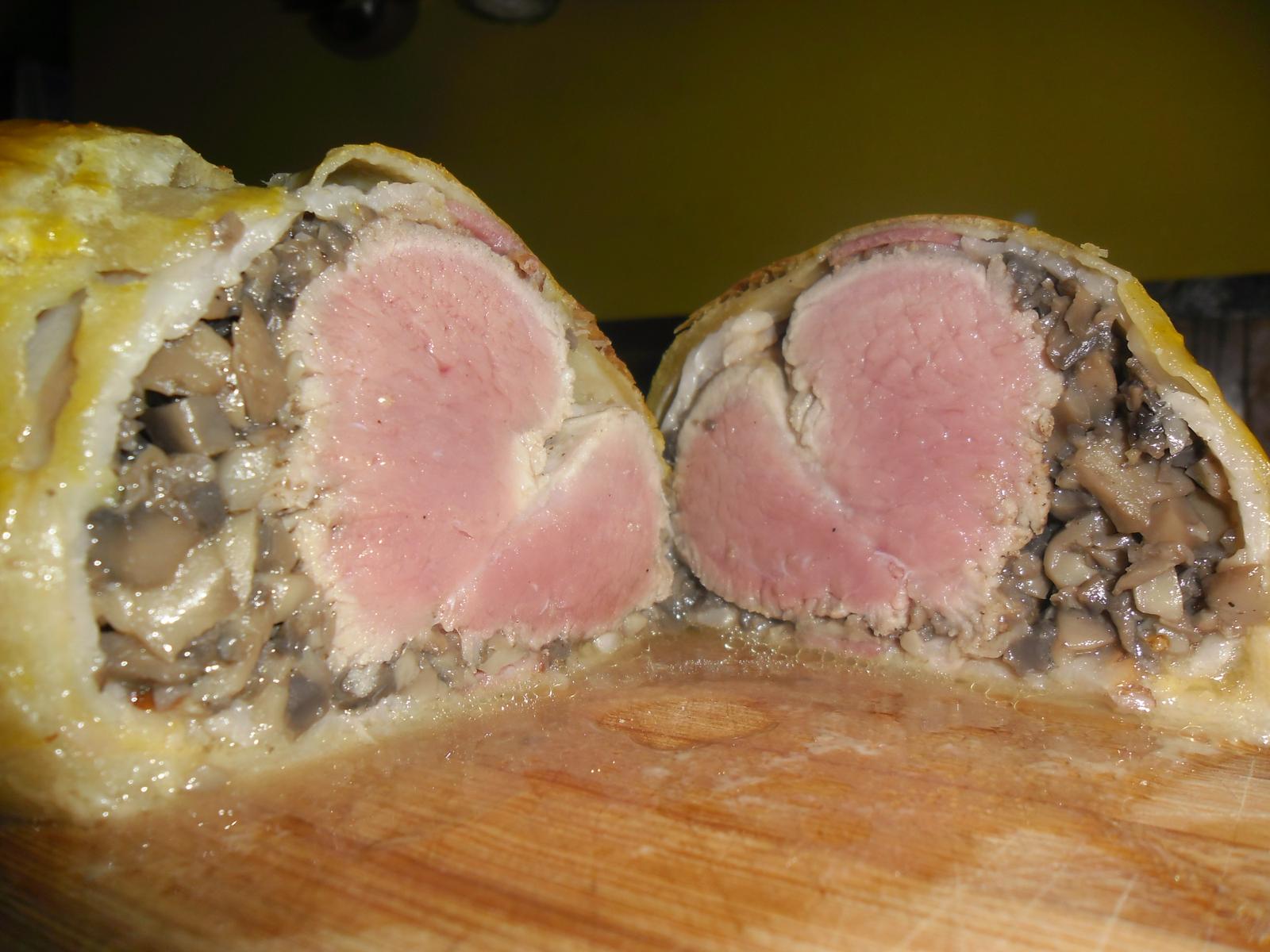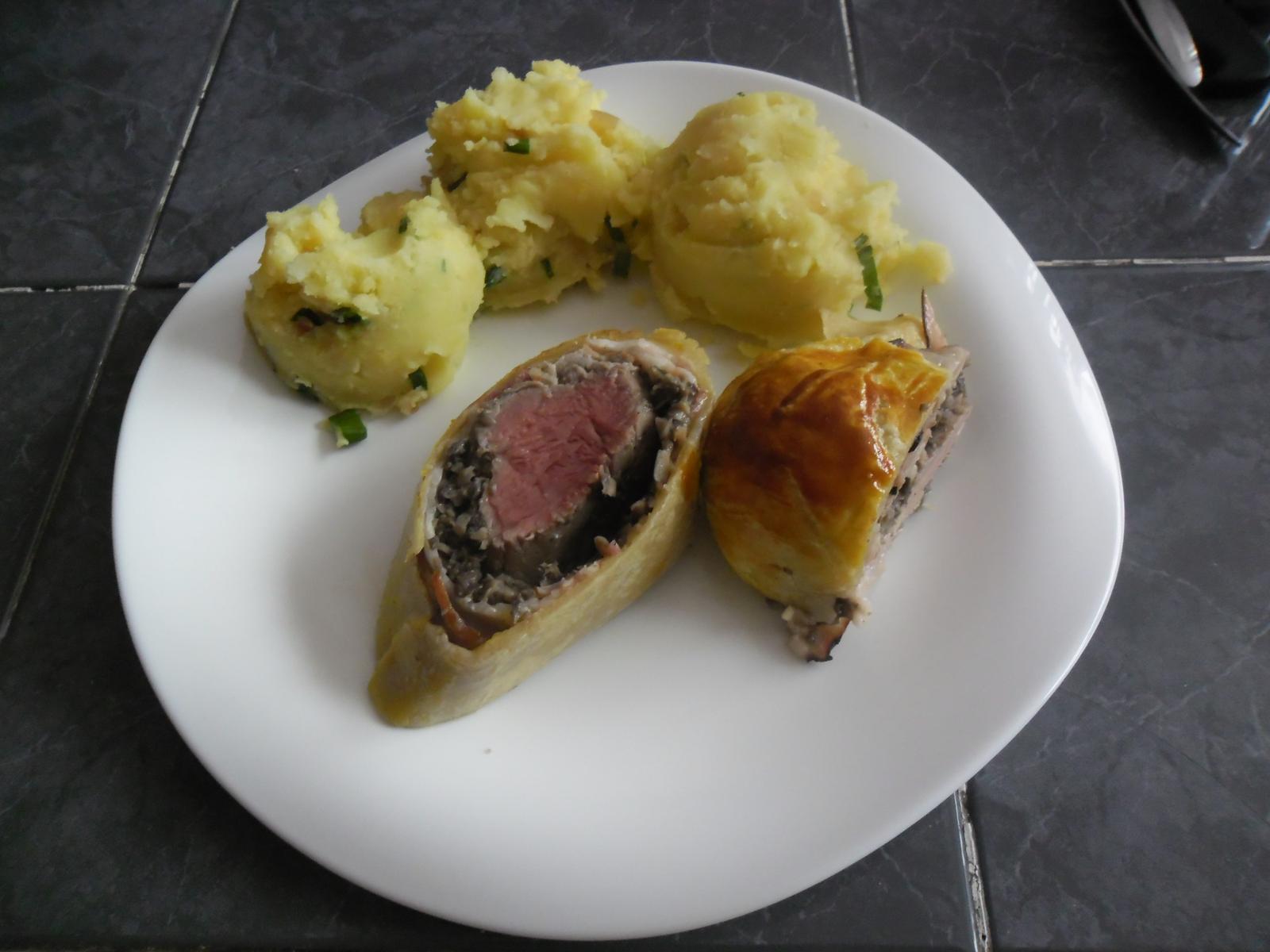 Pak je položíme na pekáč, vystlaný pečícím papírem, pomažeme z vrchu a z boků žloutkem a můžeme posypat hrubozrnnou solí. Vložíme do rozpálené trouby asi na 190 stupňů a pečeme 25 – 30 minut. /u hovězí panenky pečení protáhneme asi tak o 10 minut/. Vytáhneme z trouby a necháme ještě 10 minut odpočinout. Pak rozřežeme zoubkovaným nožem na 3cm široké plátky. Příloha může být jen podušená čerstvá zelenina. My jsme měli šťouchané brambory.