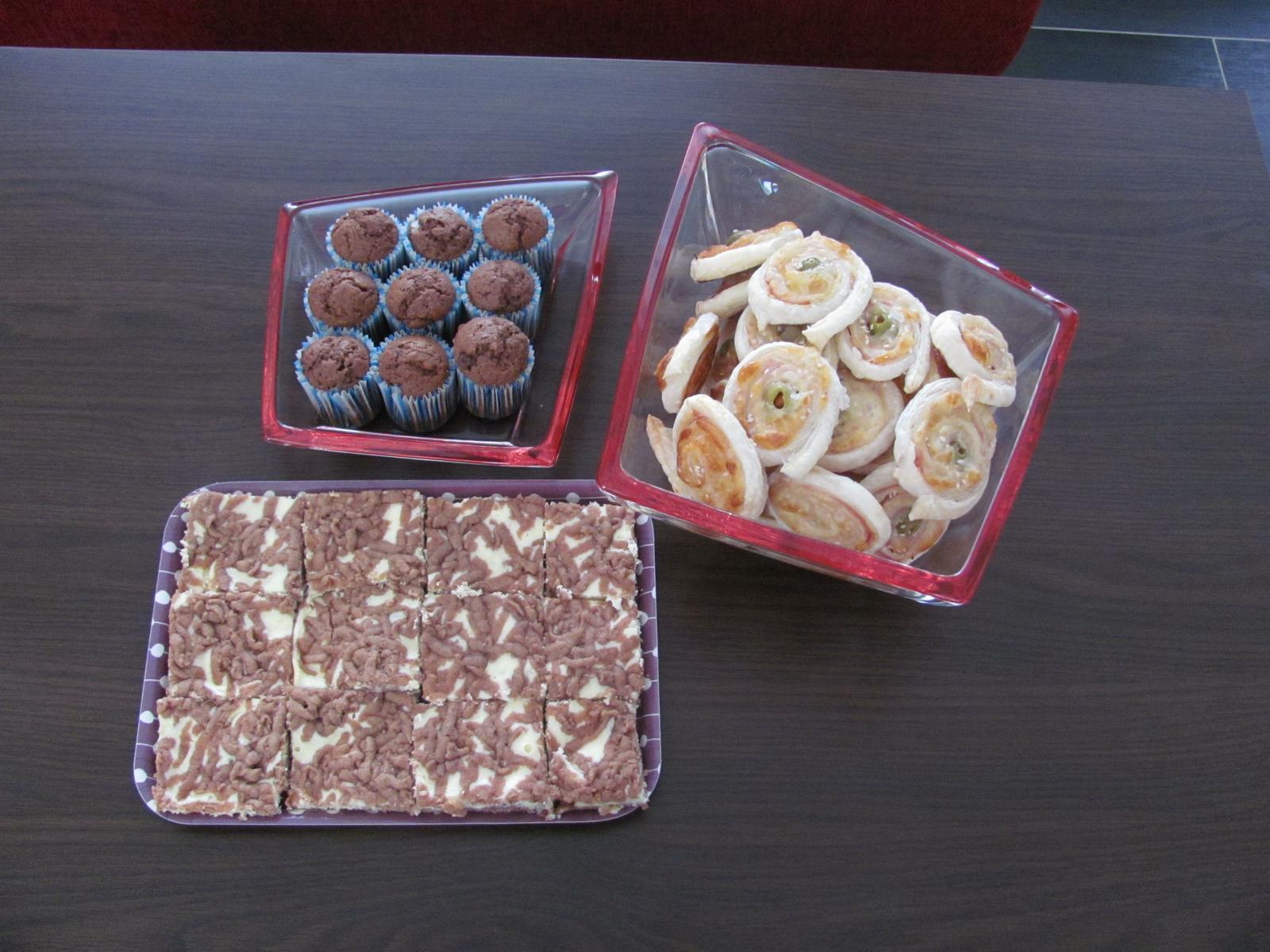 @simonka16 tak, tak. čoko muffinky, tvarohový strúhaný zákusok a tie slané, to nie sú pizza slimáky, ale také cesnakové. listkové cesto potreté bambinom + cesnak + vegeta + soľ, na to naukladaná šunka a eidam, zvinúť do rolády, nakrájať, do stredu dať olivu, posypať sezamom, upiecť a rýchlo skryť pred manželom, aby niečo ostalo aj pre návštevu 😀