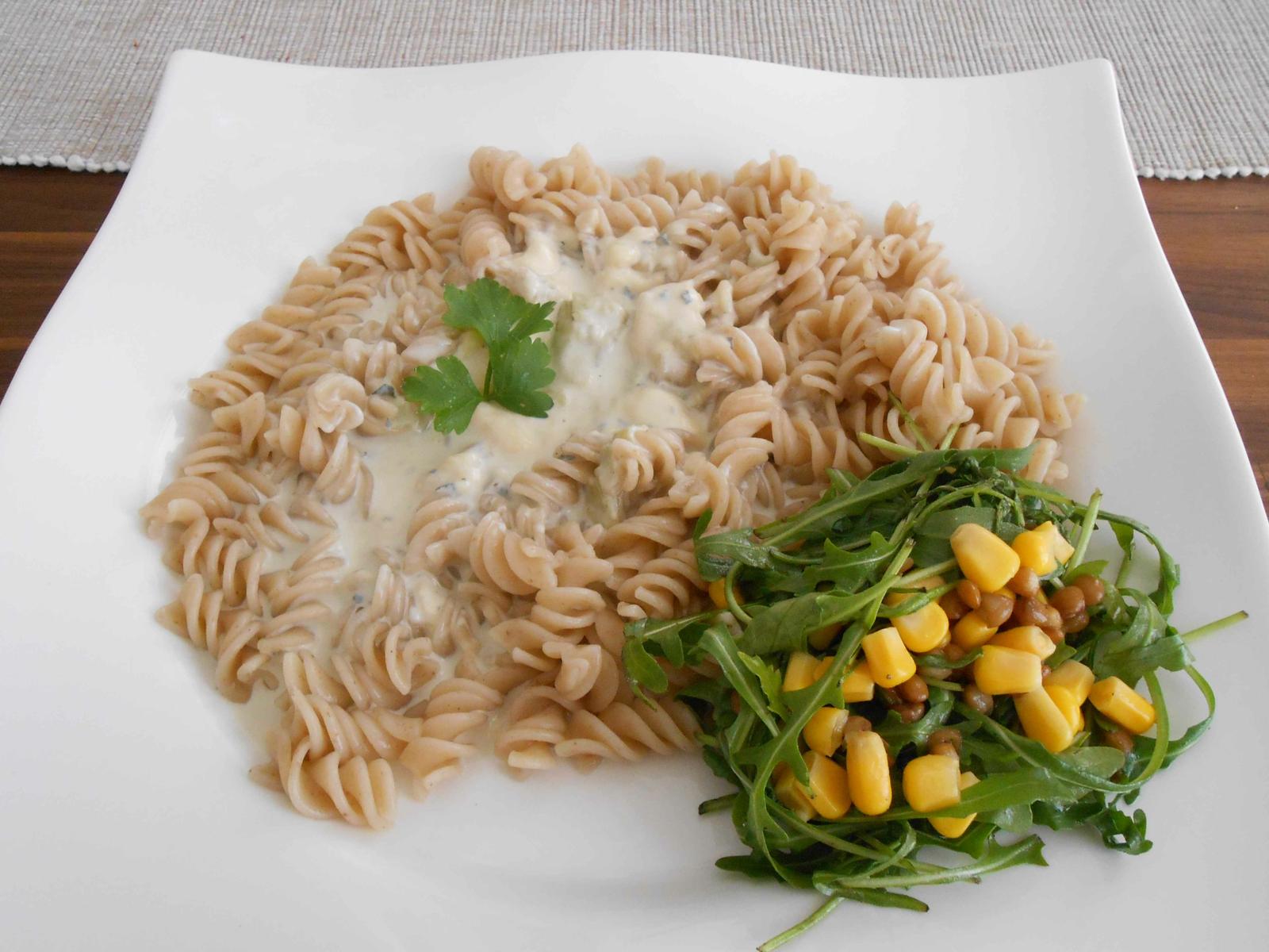 celozrnne cestoviny s nivovou omackou, rukolovo-sosovicovo-kukuricovym salatom, hruskovy kolac s pudingom z listkoveho cesta a fresh z bio pomarancov 🙂 uff a teraz sa mam ucit na skusku ...