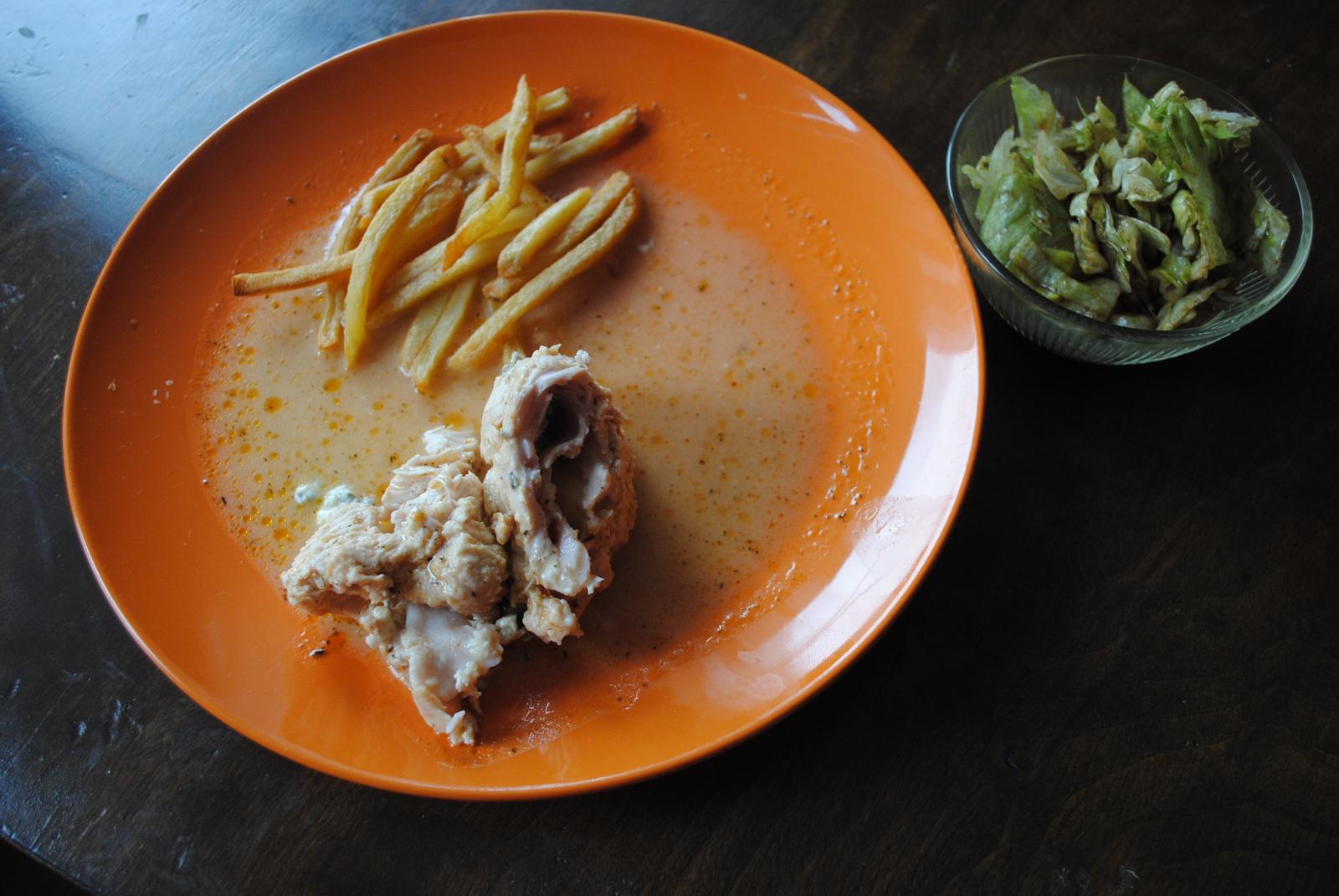 Dojedame zo vcera, rezne so zemiakovou kasou a zeleninovy salat 🙂