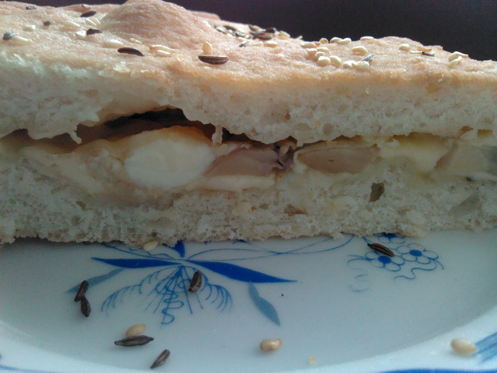 Na spodnú platňu natrieme časť maslovej plnky, na ňu dáme udusené jablká, priložíme druhý plát – potrieme maslovou plnkou, jablkami a priložíme tretí plát.