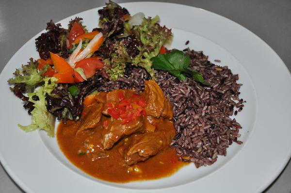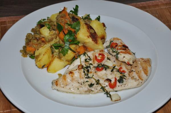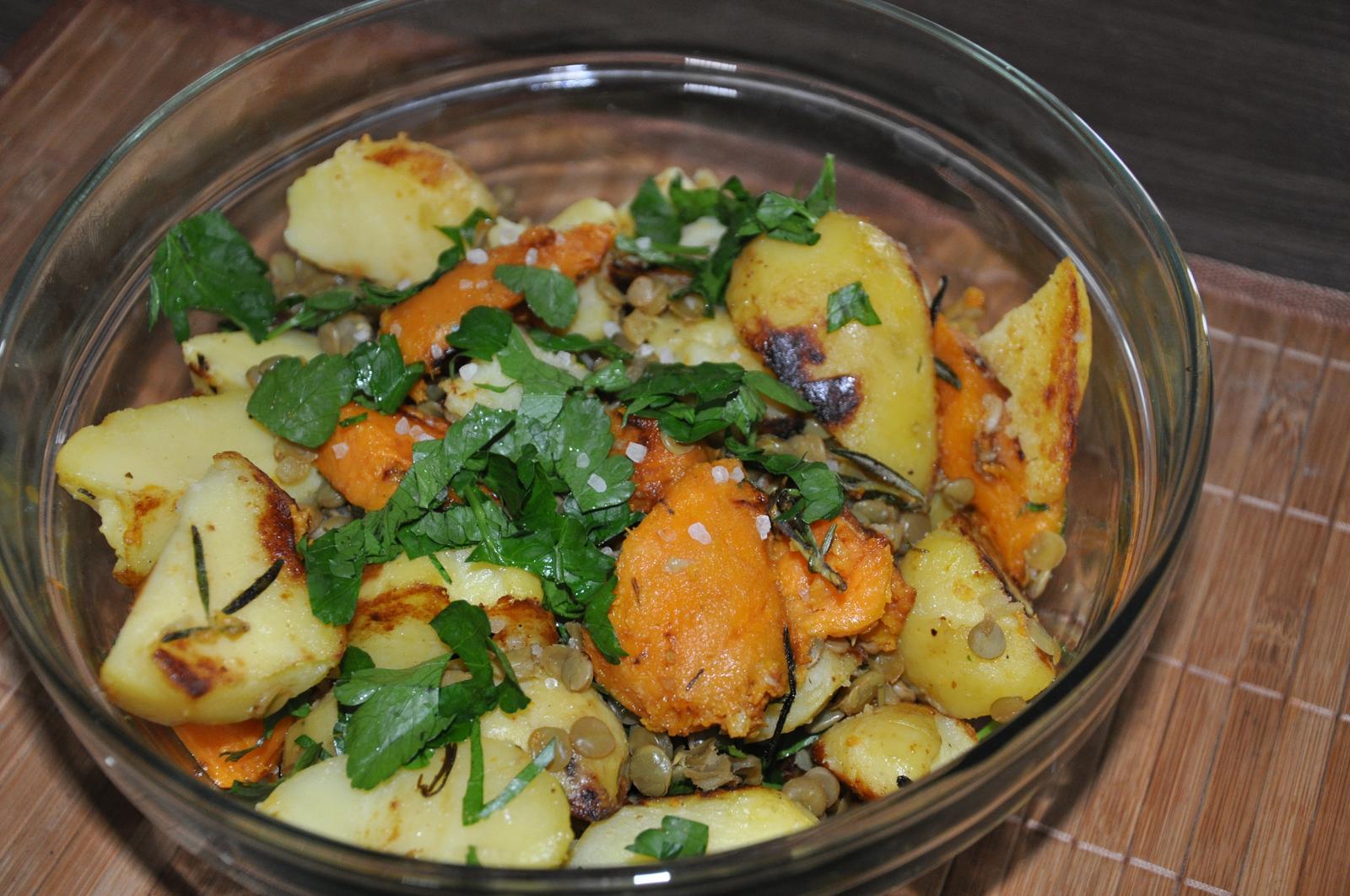 stvrtok - zemiakova polievka s cervenou sosovicou, kuracie sote v zemiakovo-cuketovej placke