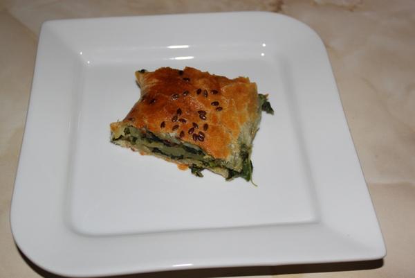 Na masle s troskou olivoveho oleja si oprazime cibulku a cesnak, pridame spenat(ak mame mrazeny, tak ho nechame rozmrazit a vyzmykame z neho vodu) a podusime, osolime, opeprime, pridame trosku slahackovej smotany cca 1/2 dcl a nechame ju zredukovat.potom pridame rozslahane cele vajicko.zmes si nechame vychladnut a pripravime si zatial listkove cesto(ja kupujem uz vyvalkane v lidly),potrieme ho rozslahanym zltkom, ktore sme zmiesali s troskou slahackovej smotany.do 3/4 cesta poukladame platky sunky, na to platkovy syr, vychladnuty spenat, nadrobno pokrajany cesnacik a rukou potrhanu mozzarellu.zatocime, potrieme zvysnym rozslahanym zltkom so smotanou a pecieme vo vyhriatej rure na 200 stupnov cca 20-25 minut.dobry chut ;o))))