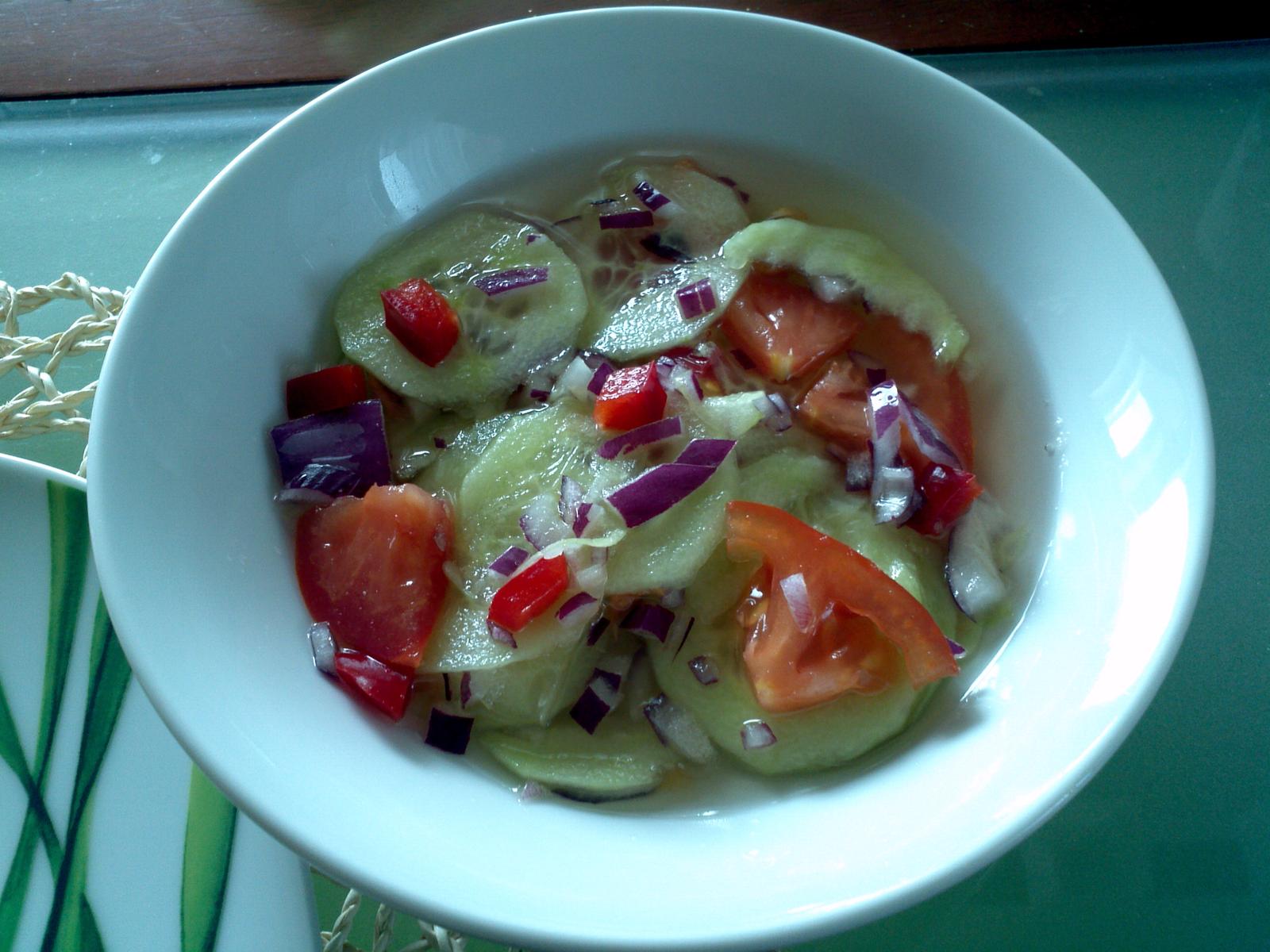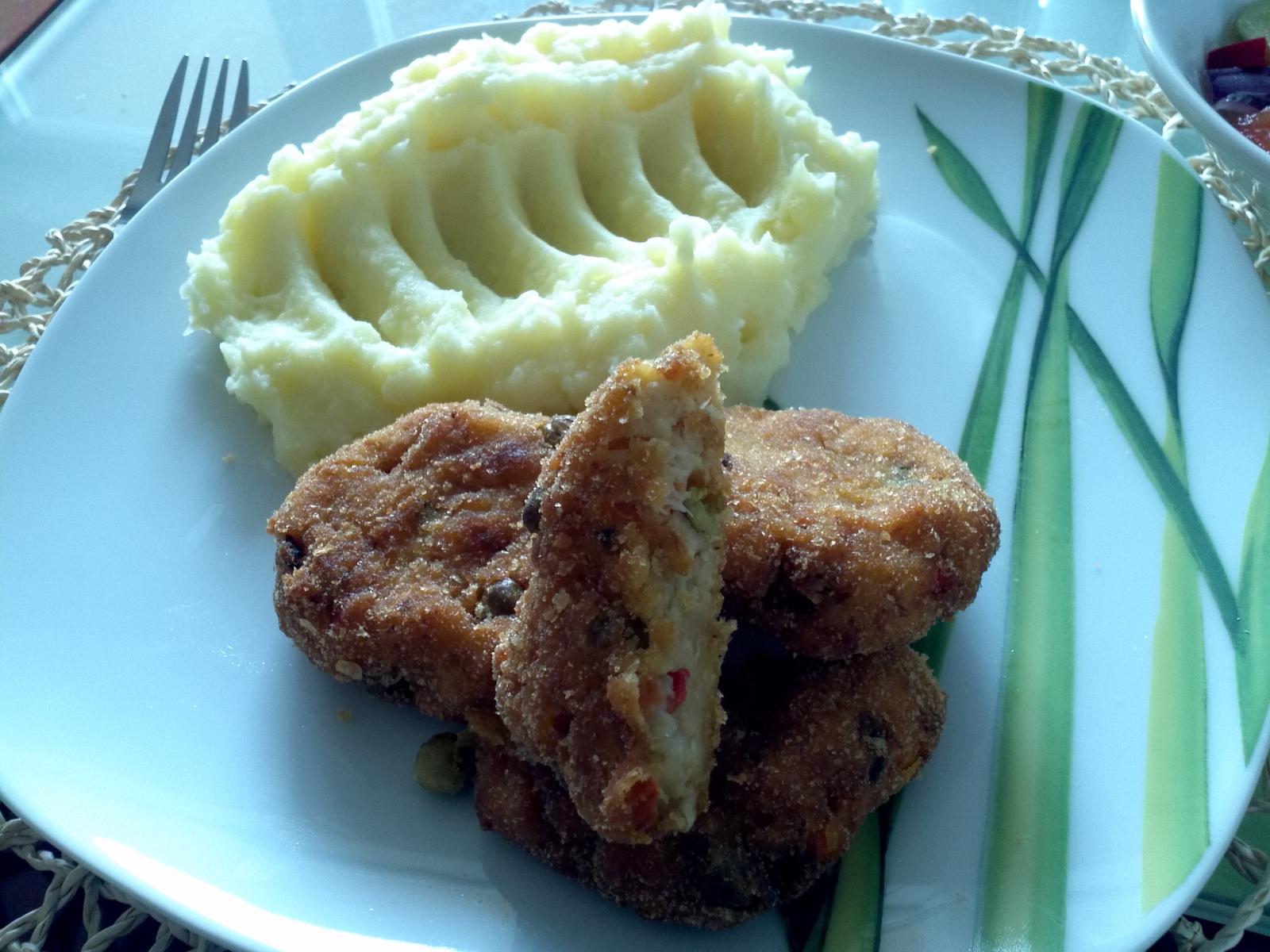 Zemiakové pyré so zeleninovým karbonátkom,uhorkový šalátik a ako dezertík pudingovo-smotanový koláčik 🙂