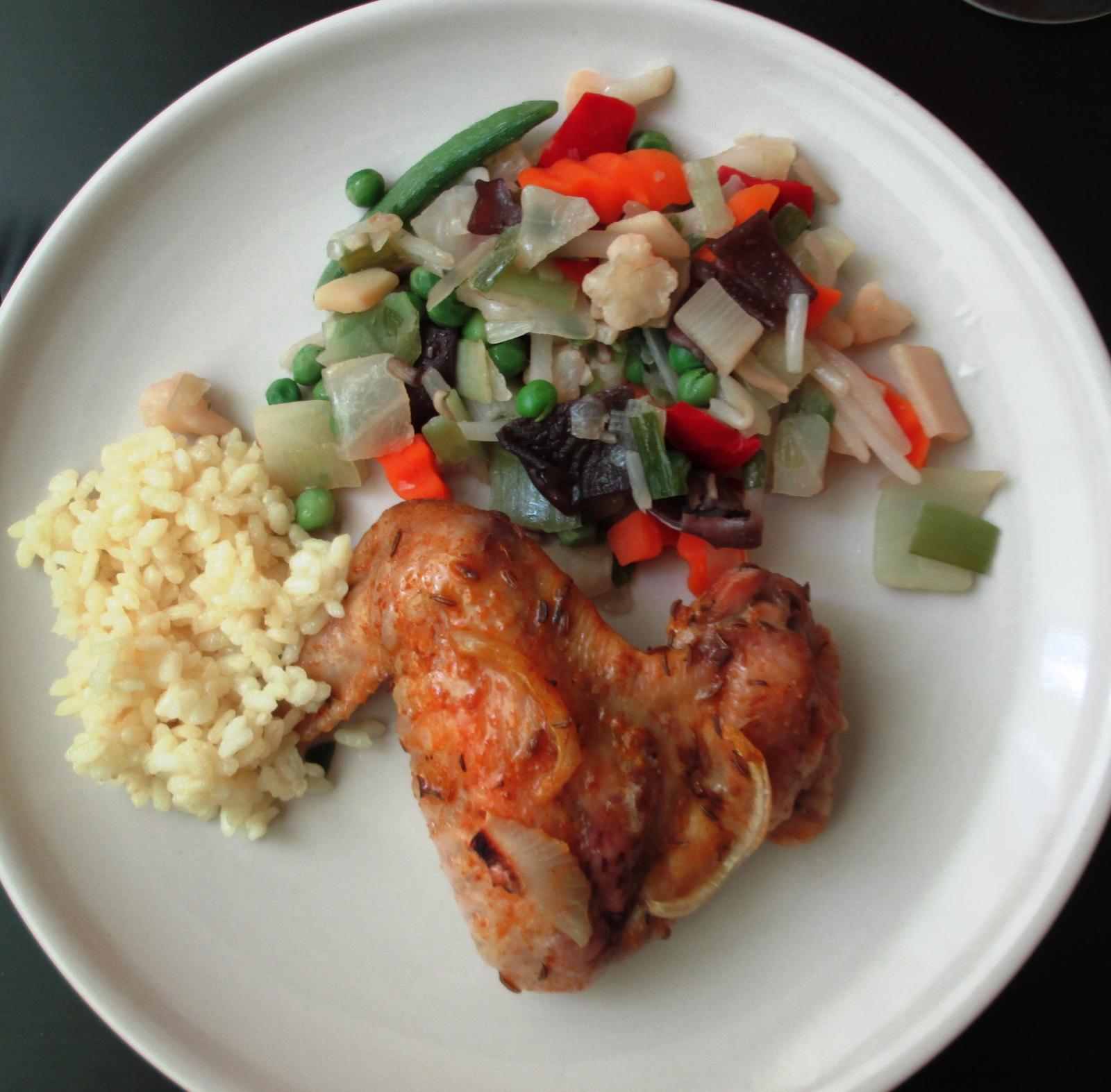 dojeme vcerajsie sci, peceny kapor so zemiakmi varenymi, salat z polnicka, jogurtovy kolac s ribezlami