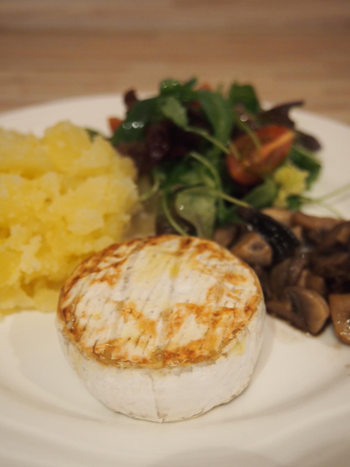 Dnešný obed - grilovaný hermelín, varené zemiaky, šalát a restované šapmiňóny a dezert - celozrnná bublanina s ribezlami a čokoládou 🙂