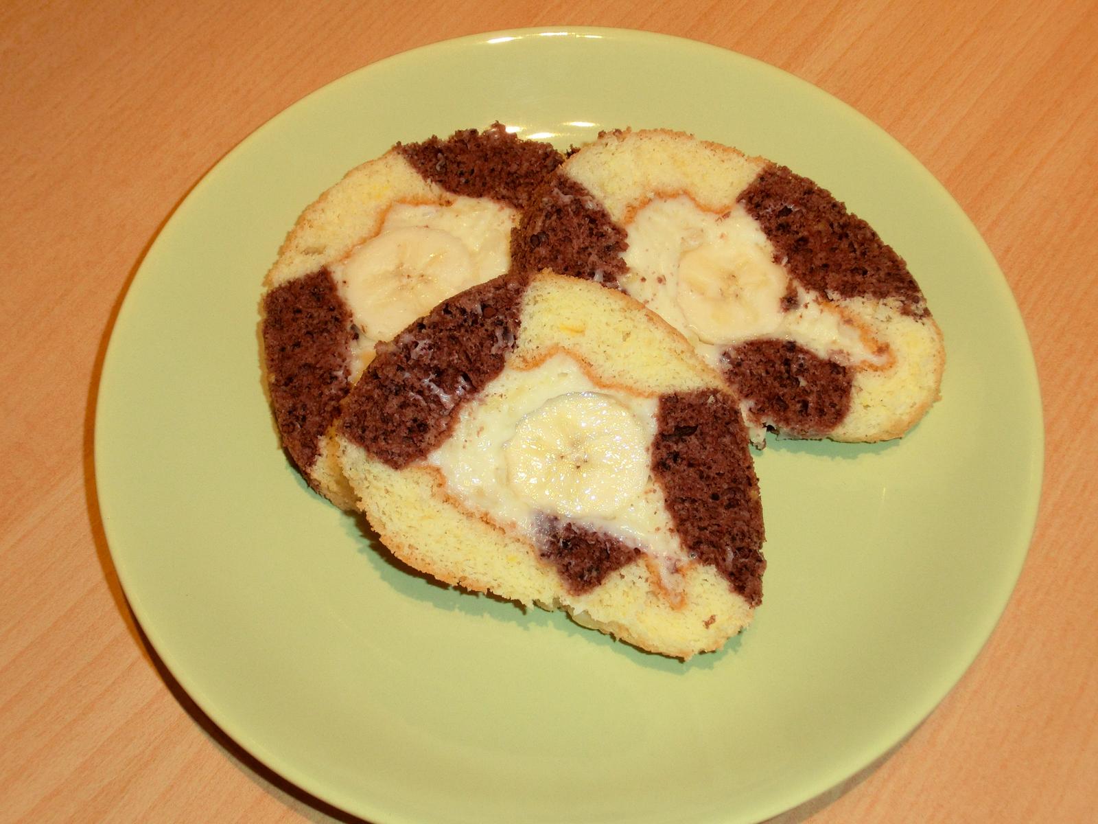 Takto pripravený krém natrieme na rozbalené cesto na pravej strane cesta na plnku polukladáme ošúpané banány (po celej dĺžke cesta) a pomalinky zrolujeme. Na cca 2 hodinky odložíme prikryté alobalom do chladničky.