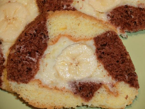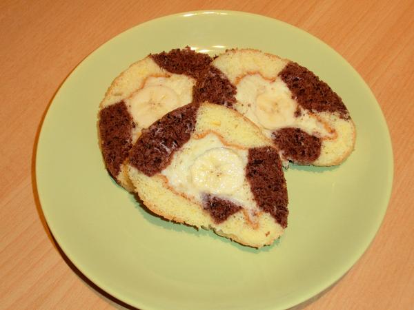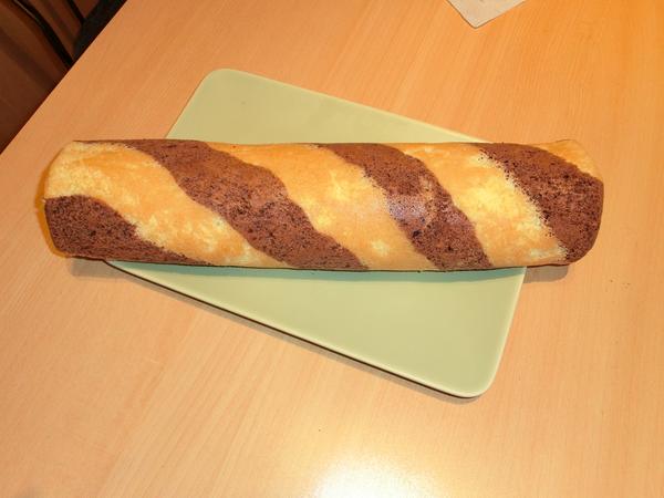 Postup: 5 žĺtkov vymiešame s kryšt.cukrom, vodou, polohrubou múkou. Do vypracovaného cesta zľahka pridáme tuhý sneh, do ktorého sme pred koncom šľahania pridali 1 pol.lyžicu kryšt. cukru. Takto urobené cesto rozdelíme na 2 časti, pričom do jednej pridáme kakao. Na pečiacim papierom vyložený plech robíme priečne cez plech pomocou lyžice striedavo pás tmavého a svetlého cesta. Takto pripravené cesto pečieme cca 20 min. pri 180stup. Po upečení ešte teplé cesto zbavíme pečiaceho papiera, a zrolujeme do tvaru rolády v látkovej utierke. Kým si cesto v utierke oddychuje 😉 pripravíme si plnku: v 100 ml mlieka rozmiešame múku, pudingový prášok a 2 žĺtky. Do zvyšného mlieka (400ml) dáme cukor, vanilkový cukor, puding a uvaríme. Do vlažného krému zašľaháme maslo a dáme krém vychladnúť.