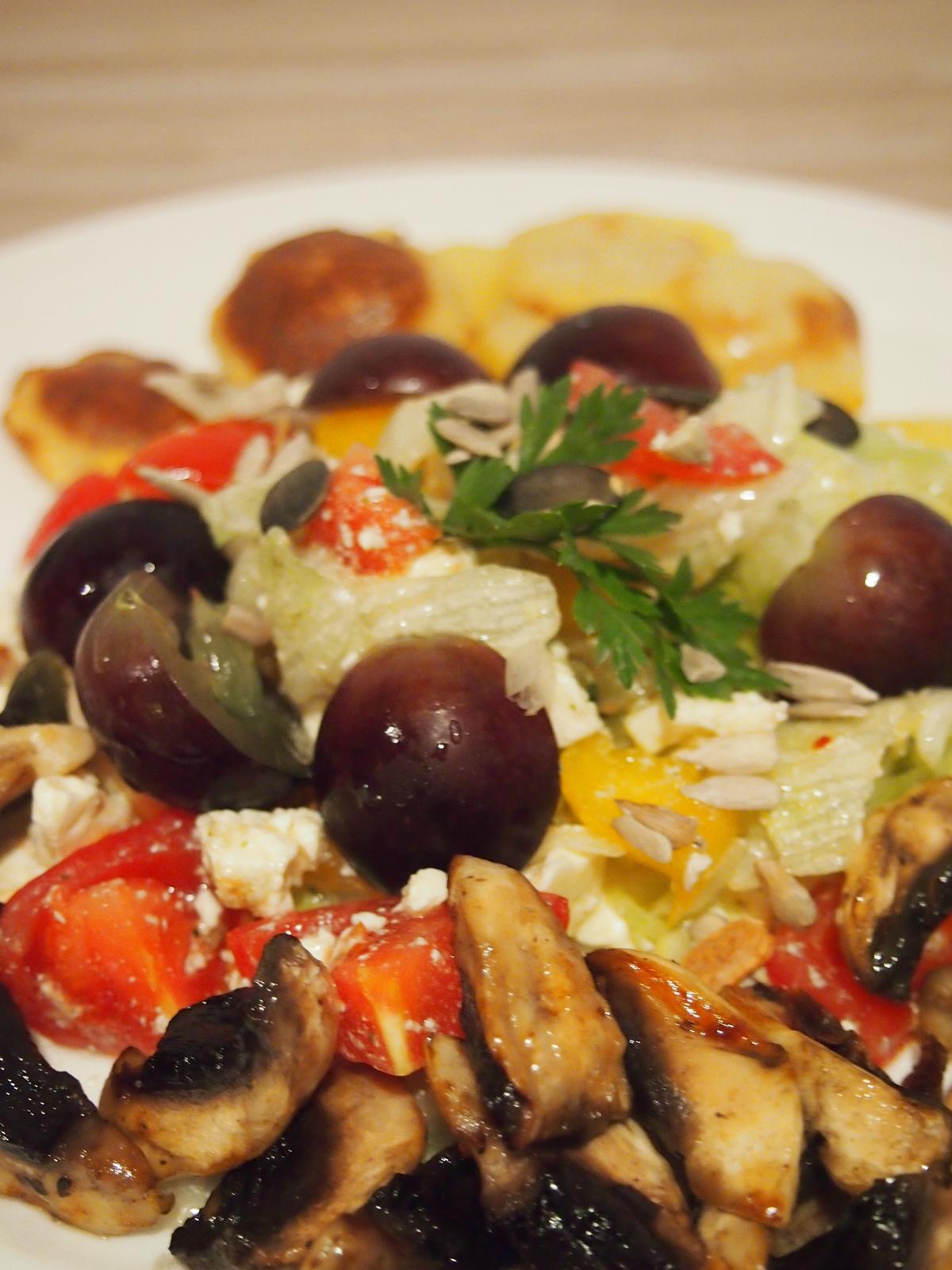 Dnešný obed - šalát s fetou, šampiňónmi, orechmi, semienkami a červeným hroznom 🙂