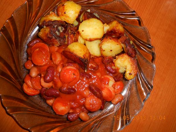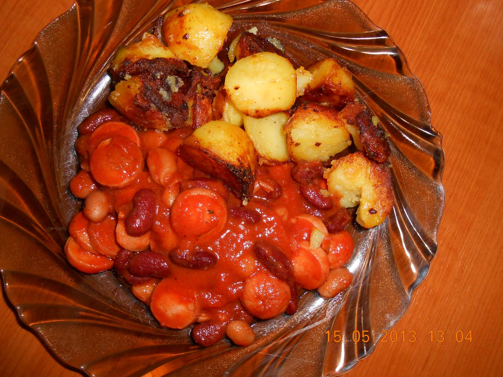 Ja som dnes manželovi navarila Pikantnú fazulu s párkom (ako oheň-na môj vkus až moc štiplavé, ale manžel to miluje) a opekané zemiaky... a ešte tvarohové palacinky... 🙂