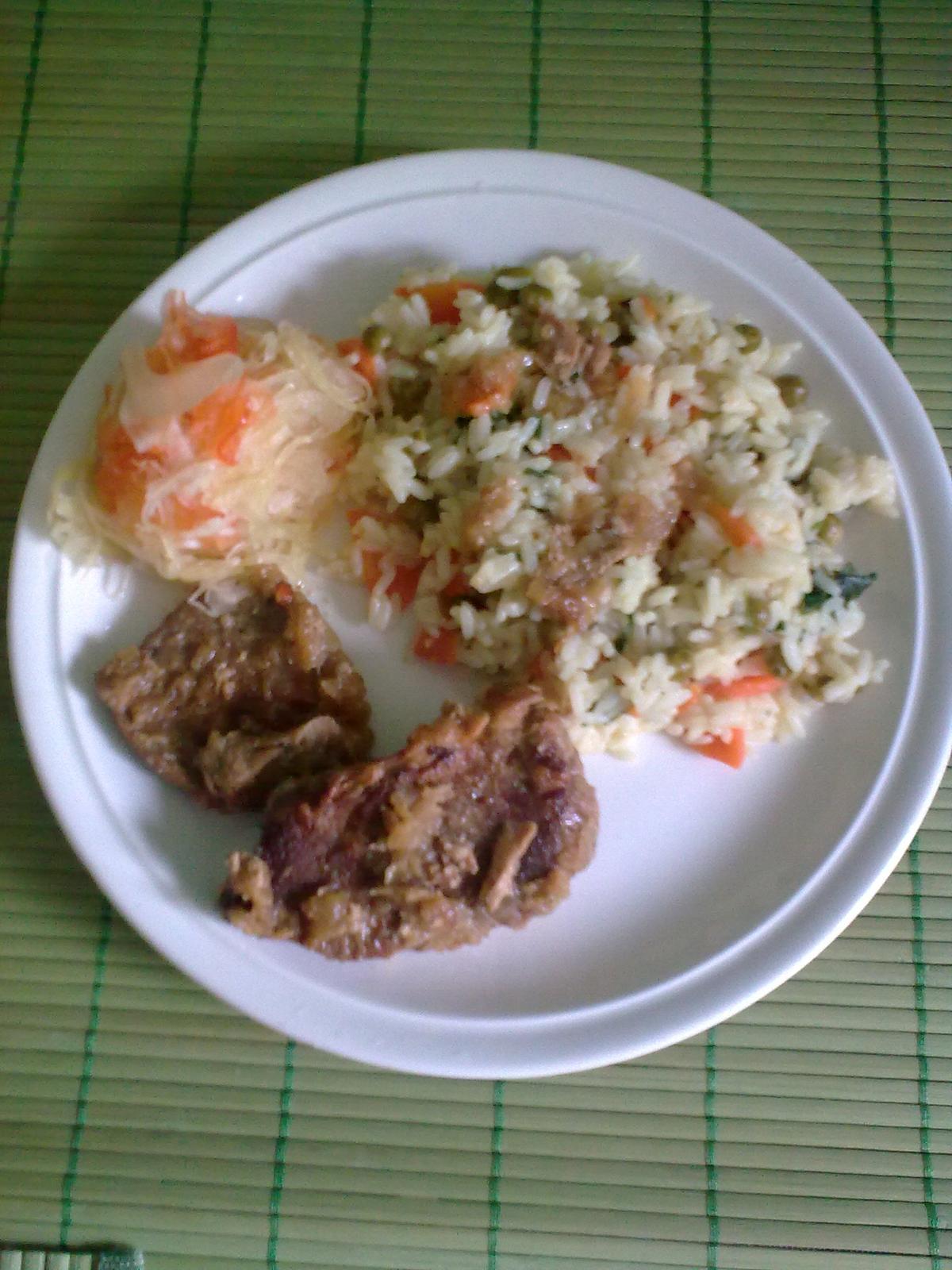 A foto: pecena krkovicka + ryza s mrkvou, hraskom, petrzlen.vnatou + domaca calamada.