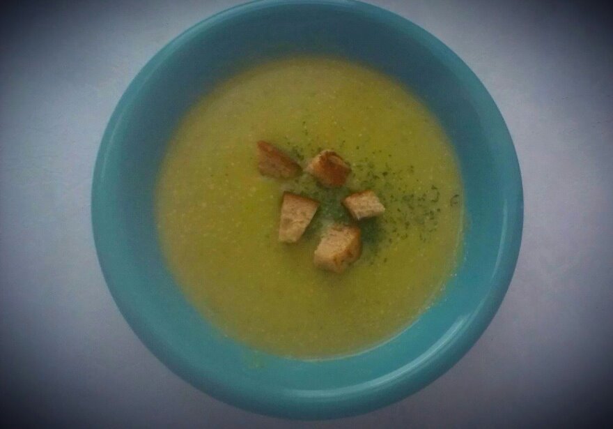 u nás dnes cuketová krémová polievočka a žemľovka z vianočky s tvarohom a jabĺčkami 🙂