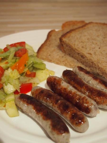 Grilované klobásky (kvalitné s vysokým podielom masa) so šalátom a domácim celozrnným chlebom