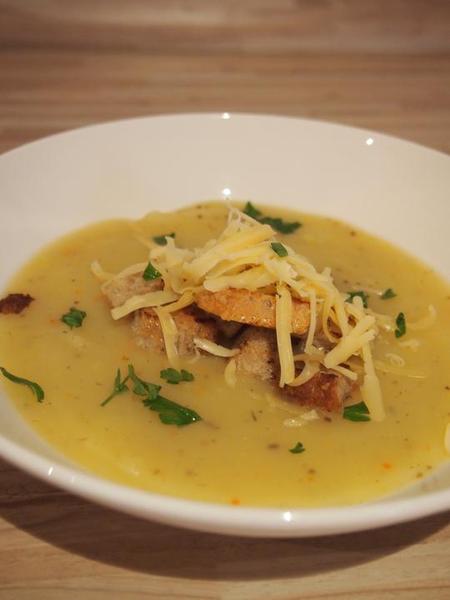 Krémová zemiaková polievka s krutónmi z domáceho chleba, so syrom a petržlenovou vňaťkou
