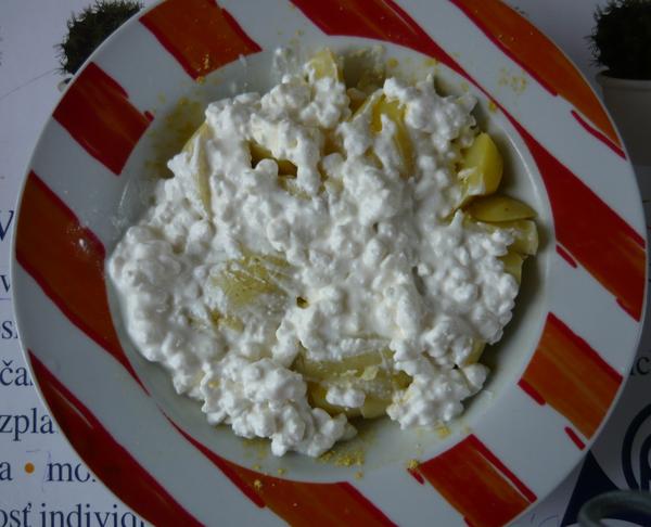 milujeme nové zemiačiky, tak dnes varené v šupke, očistené, pokrájané na kolieska + bylinkové korenie+ cottage syr zmiešaný s bryndzou......