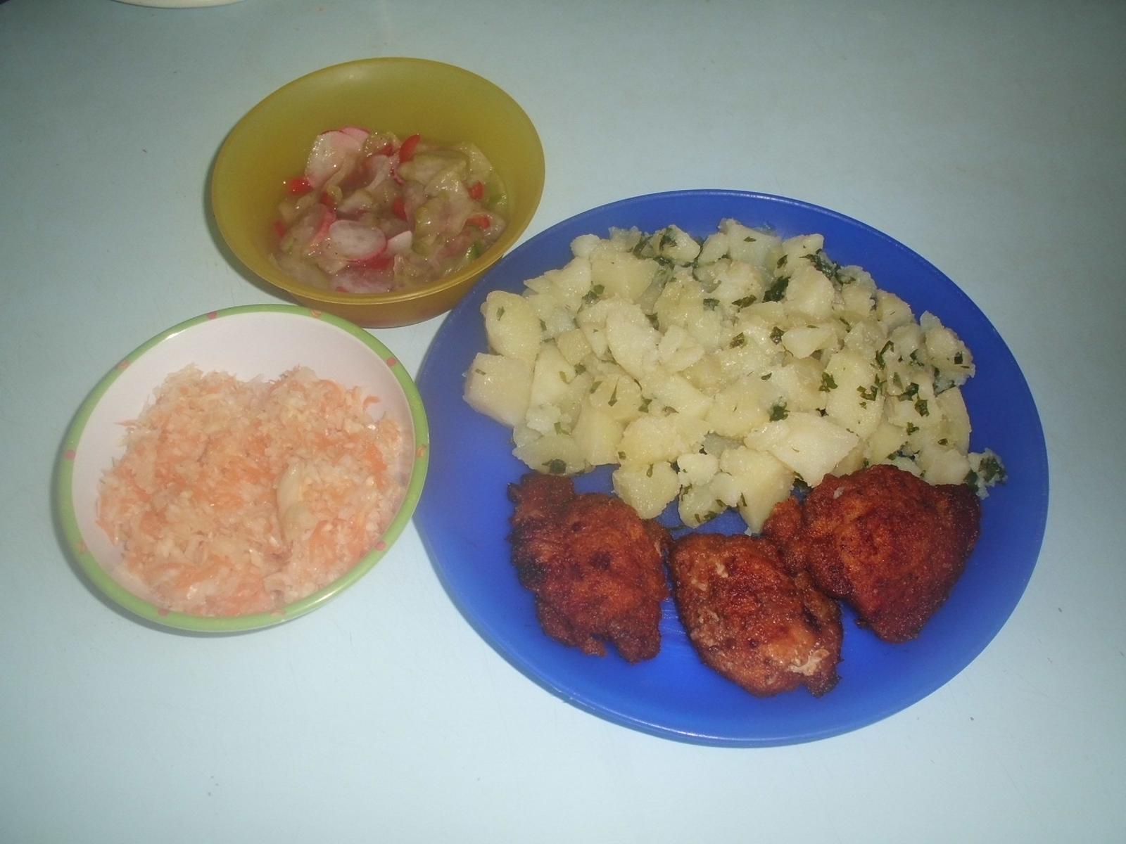 Morčacie medailoniky( obalené len v múke s červenou paprikou, rascou a solou) , nové zemiaky s vňaťkou + mrkvovo-kapustový a uhorkový šalát. je to bleskovka...zatiaľ čo malá bola na nočníku tak som zvrtla komplet obedík a mohli sme si vyraziť von 😉