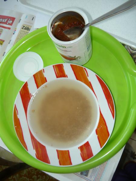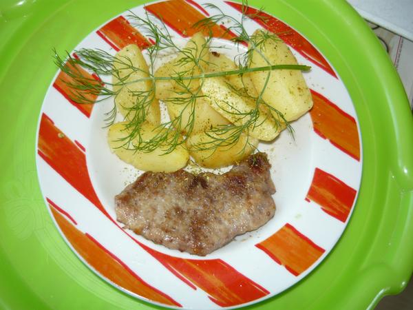 ahojte, dnes veľmi jednoduchá polievka ale výborná : s vriacou vodou z uvarených zemiakov som zaliala pohánkové vločky, pridala som extrakt z kuracieho bujónu bez tuku. Po dlhom čase som kúpila 3 plátky falošnej hovädzej sviečkovej, vyklepala som, osolila, obalila v múke a piekla som 20 minút. K mäsku som podávala varené zemiaky / 20 min./ potom som ich opiekla vo výpeku z mäska. Už si dávam zaslúženú kávičku....../ mám všelijaké taniere, ale najlepšie mi chutí z tohto červeno-bieleho hlbokého taniera..../