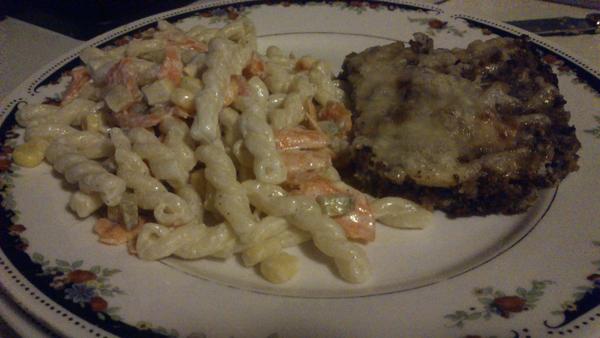 Studený cestovinový šalát , také ľahšie vydanie len zo zeleninkou a light smotankou 🙂 a k tomu zapekané hovädzie mäsko s celozrným chlebíkom ( to išlo do toho mäska) .