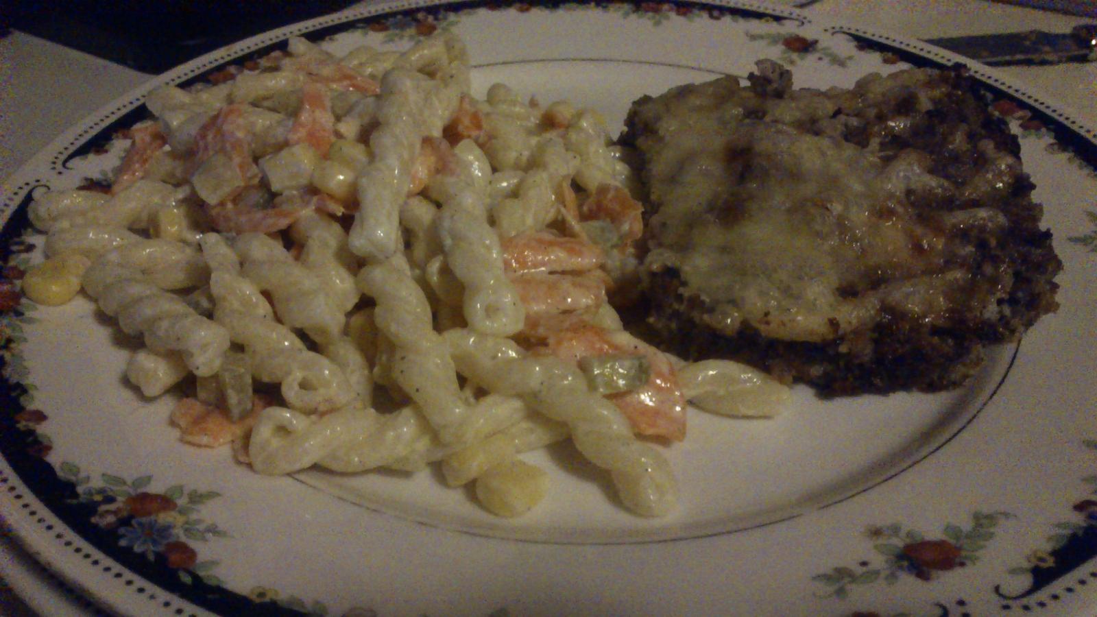 Studený cestovinový šalát , také ľahšie vydanie len zo zeleninkou a light smotankou 🙂 a k tomu zapekané hovädzie mäsko s celozrným chlebíkom ( to išlo do toho mäska) .