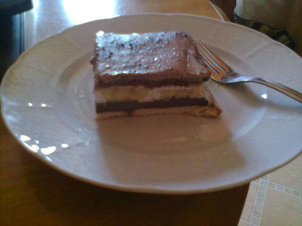 tekvicový prívarok, varené zemiaky, vajíčko a opečený špekáčik. Na mlsanie černicový koláč so želatínou 🙂