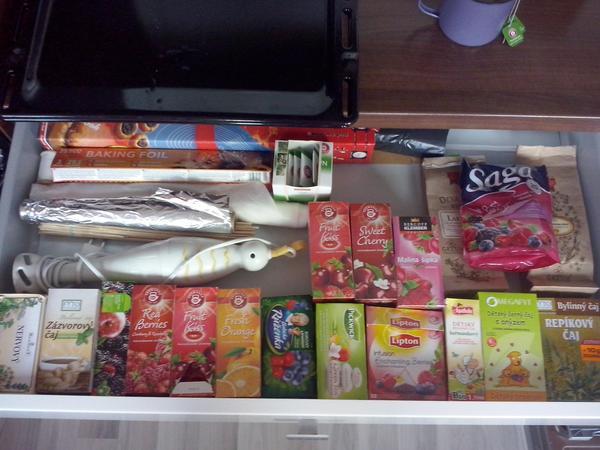 Doplnila som aj šuplík s čajíkmi, na výber máme terz 19 druhov čaju 😝 - moja úchylka!!!!