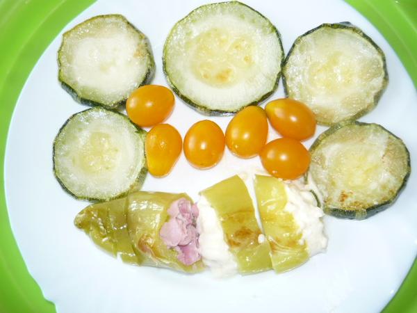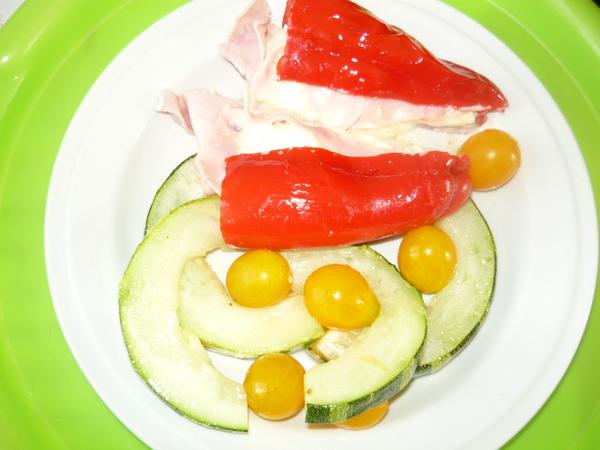 včera plnená paprika s taveným syrom, šunkou + príloha dusená cukina. Dnes slepači polievka s krupicovými haluškami, plnená paprika s bryndzou a šunkou+príloha dusená cukina.
