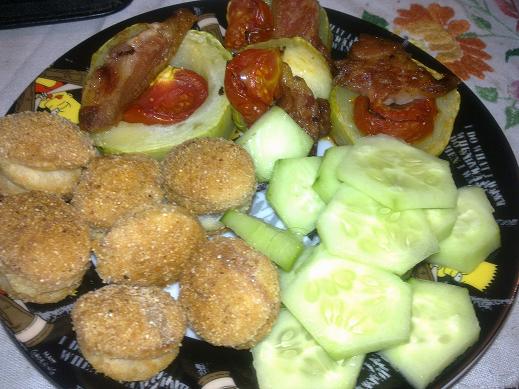 dnes kurací vývar a grilovana cukina s paradajkami a slaninkou a k tomu zemiakové pagáče 🙂
