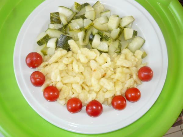 na raňajky slaný cukinový koláč s balkánskym syrom, obed cukinová polievka s kukuričkou a z uvareného mäska z kuracej polievky soté na smotane so šampiňónmi a kukuričné cestoviny (všetko bezlepkové a bezlaktózové)