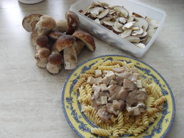 Dubáčiky podusené na cibuľke, tofu, kyslá smotana (v mojom prípade biely jogurt), korenie, soľ + cestoviny. S tofu netradičná kombinácia, ale je to výborné 🙂