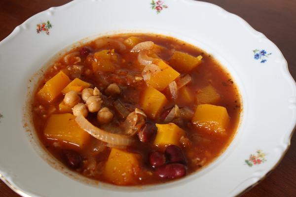Nasa sezonna polievka, horuca a trochu pikantna, akurat na jesen 🙂 S tekvicou, paradajkami, chilli, fazulou a cicerom. Dala som aj rimsku rascu.