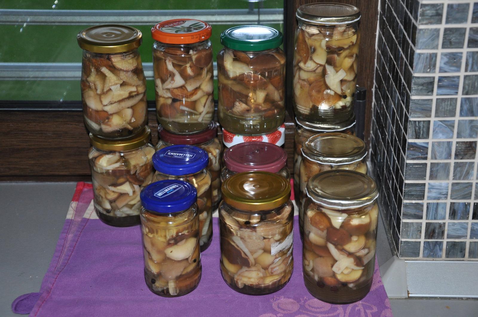 a moje hribiky 🙂 Mala som plny kosik a celkovo mi trvalo 5 hodin kym som ich ocistila, umyla, prevarila, nachystala pohare, uvarila nalev a sterilizovala a este som aj dala 3 poschodia do susicky. A tak sa z nich tesim. Bude to hotova delikatesa 🙂 Recept na nalev mam od mojej tety, je bez nakladacu. Vyslo mi 14 poharikov.