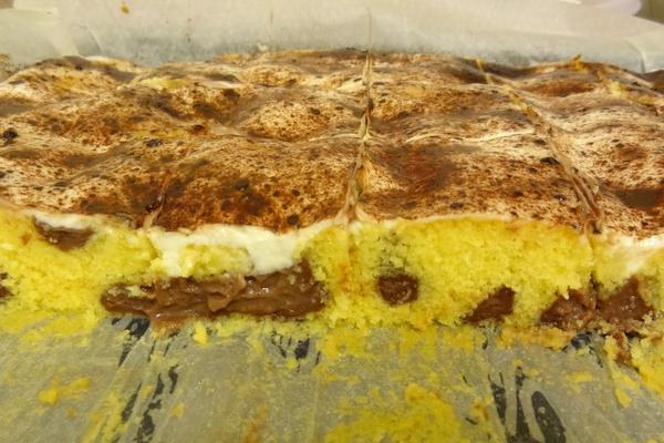 Vznikne nám redšie cesto ktoré vylejeme na vymastený a múkou vysypaný plech a pečieme cca 30 minút na 175 C. Upečený horúci koláč natrieme jahodovým džemom a posypeme nastrúhanou čokoládou a necháme vychladnúť.