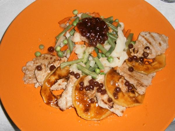 ... včera sme mali výročie, tak bola romantická, ľahká večera( bravčové mäsko, karamelizované jabĺčko, varená zeleninka, brusnice) v podaní môjho manželíka a ja som robila dezert (piškóta, banán, piškóta, čokoláda) 🙂 chutila úúúúúžasne...k tomu vínko 🙂 hudba....a najlepší manžel na svete 🙂