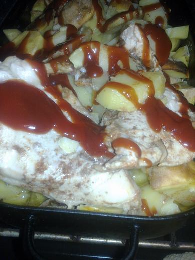 včerajšie prsty so šalatom a dnes paradajková polievka a jordanske kura,foto ešte pred zagrilovaním 😀