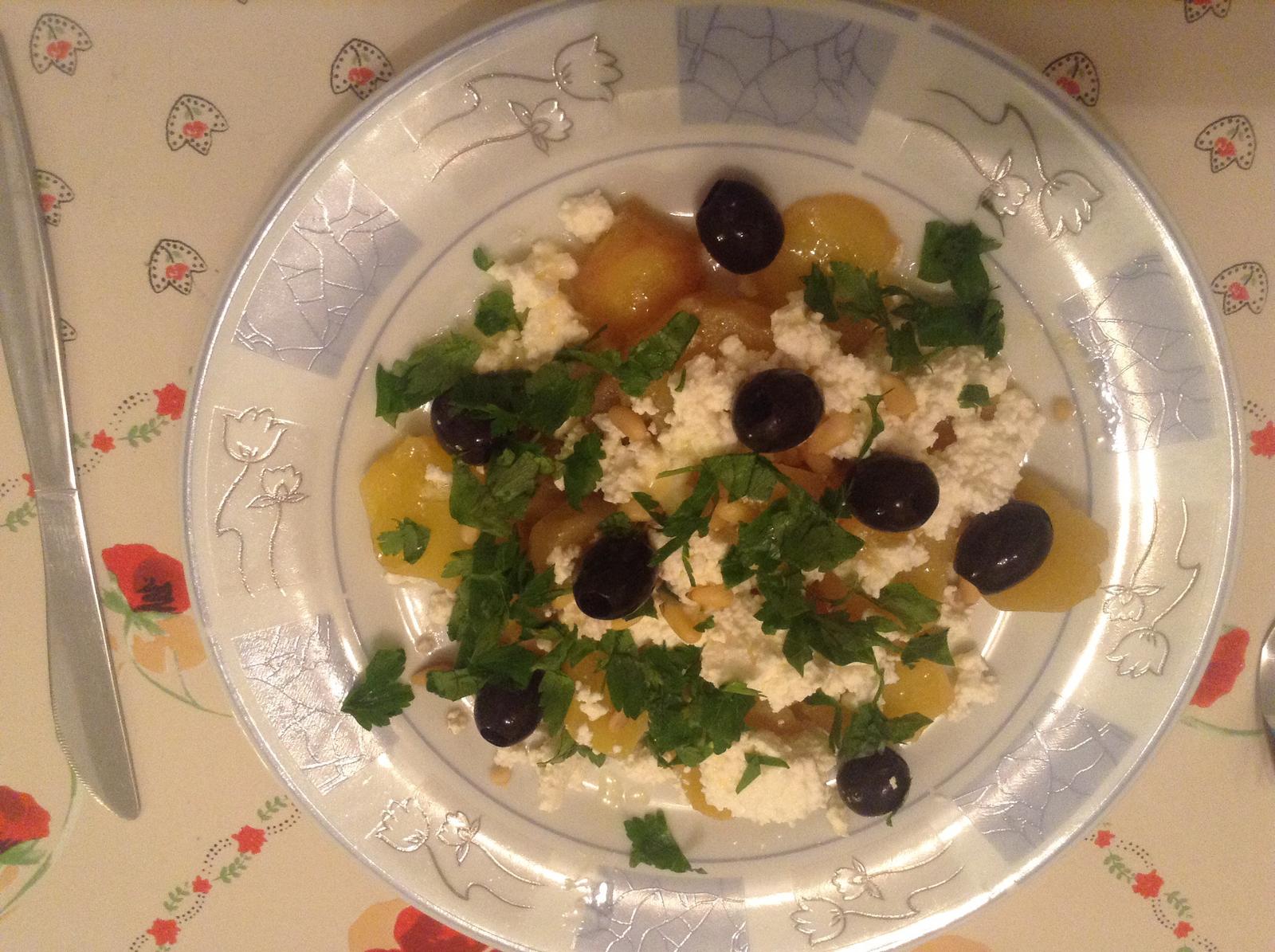 A na jednom obrazku su aj zemiaky s tvarohom, olivami, piniovymi semienkami a petrzlenovou vnatou, chutilo nam to 🙂)