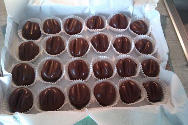 Čokoládu a Ceru rozspustíme nad parou na hustejšiu hmotu a necháme vychladnúť. Piškóty, orechy, kakao, cukor, zmäknuté maslo, rum, 4PL kávy a 3PL roztopenej čokolády zmiešame. Na doske posypanej práškovým cukrom z vypracovanej vláčnej hmoty vytvoríme valček s priemerom cca 3cm. Valček nakrájame na plátky široké cca 1,5cm. Z každého plátku urobíme guľôčku, ktorú prstami mierne roztlačíme do podlhovastého tvaru a rúčkou varešky vytvoríme priehlbinu. Každé zrno polejeme čokoládovou polevou a necháme vychladnúť.