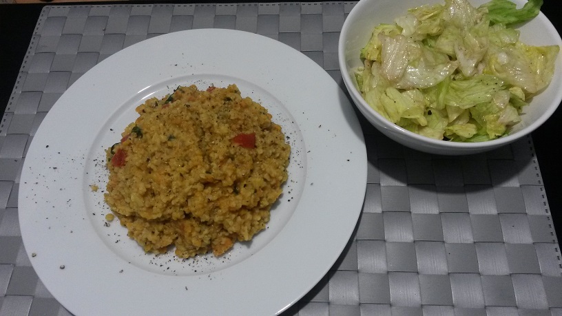dnes bulgur s cervenou sosovicou na indicky sposob, k tomu zeleny salat.