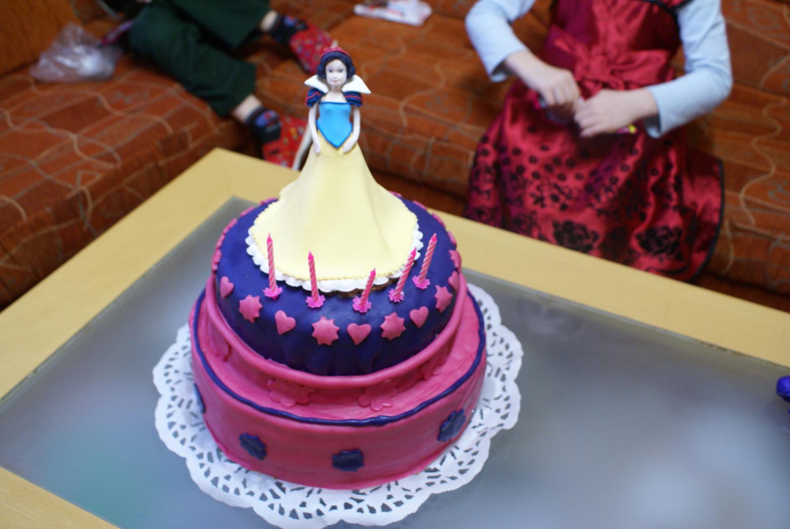 Moja prvá poťahovaná torta pre dcérku k narodeninám. Snehulienku so kúpila hotovú. 🙂