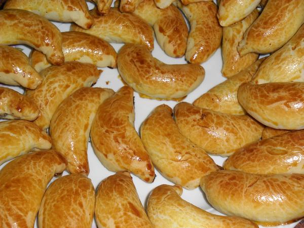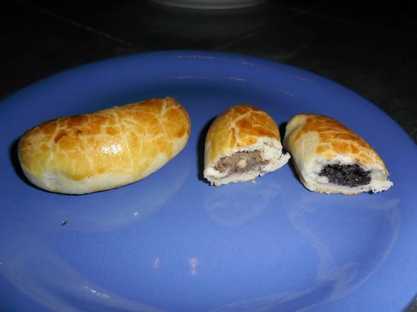 Z vykynutého cesta urobíme asi 50 cm válec. Z neho odkrajujeme kúsky asi 20 – 25 g. Z kúskov cesta urobíme guľôčky. Guľôčky cesta rozvaľkáme na malé oválne placky a do ich stredu vložíme sformované valčeky plnky (musí jej byť minimálne toľko, aká je hmotnosť cesta).