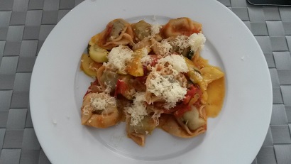 takze kedze energie v 40. tyzdni nie je az tak vela, tak dnes len tortellini so spenatovou - ricotta plnkou, k tomu domaca rajcinova omacka s kuskami cukety a ako predjedlo zeleny salatik ochuteny balsamicom a lanovym olejom.. muzovi ale veelmi chutilo 😉