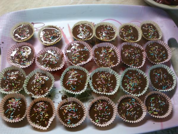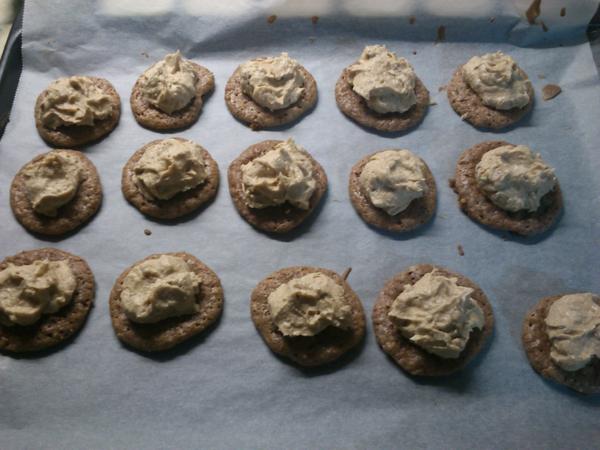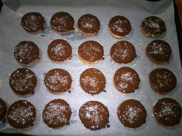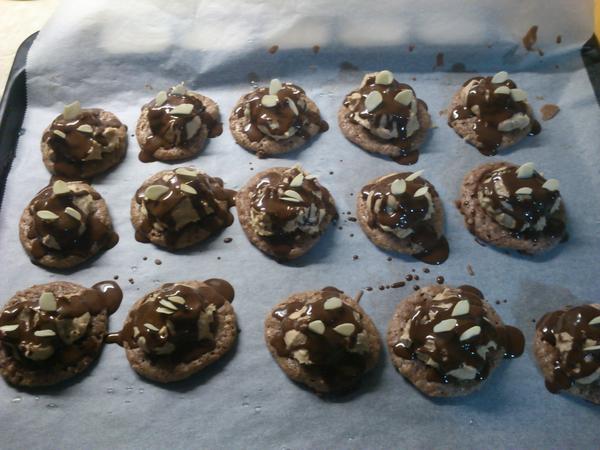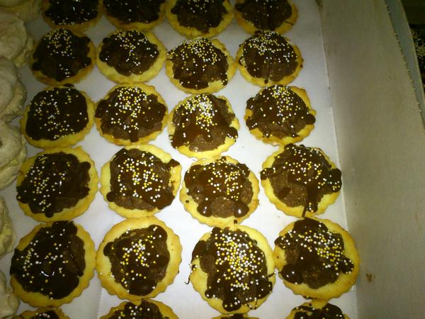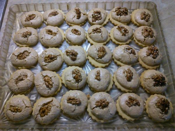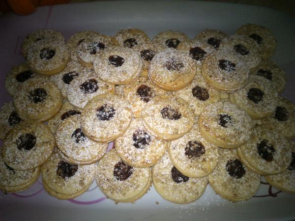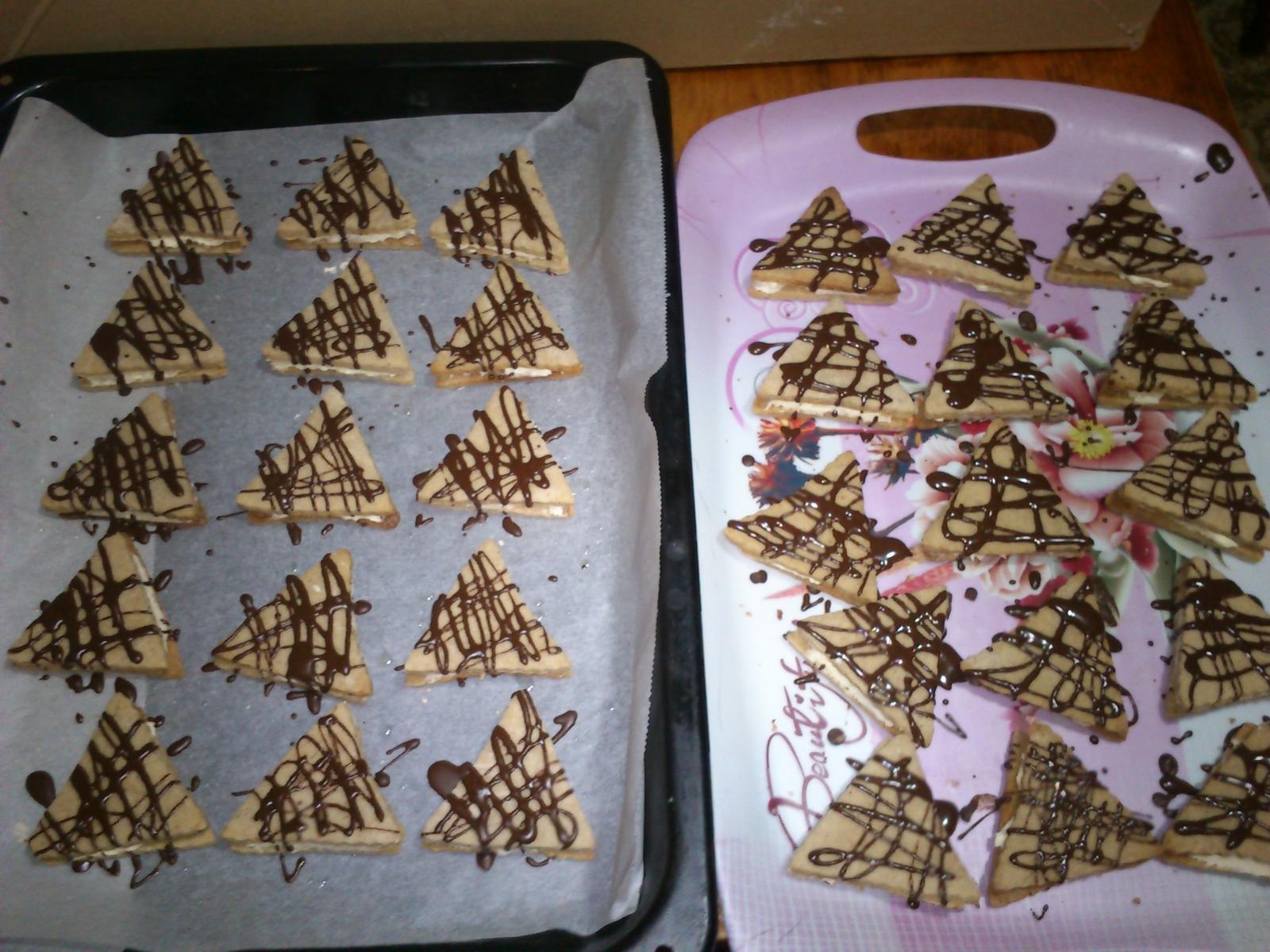 Domáci priateľ: 30 dkg hl. múky,250dkg hery,12 dkg pr.cukru,15 dkg orechov, 2 pl rumu - vypracovať cesto, vykrajovať, upiecť a zliepať orig. je čoko krém, ja lepím džemom, poliať čokoládou a na vrch dať rozpolenú ošúpanú mandlu/orech.