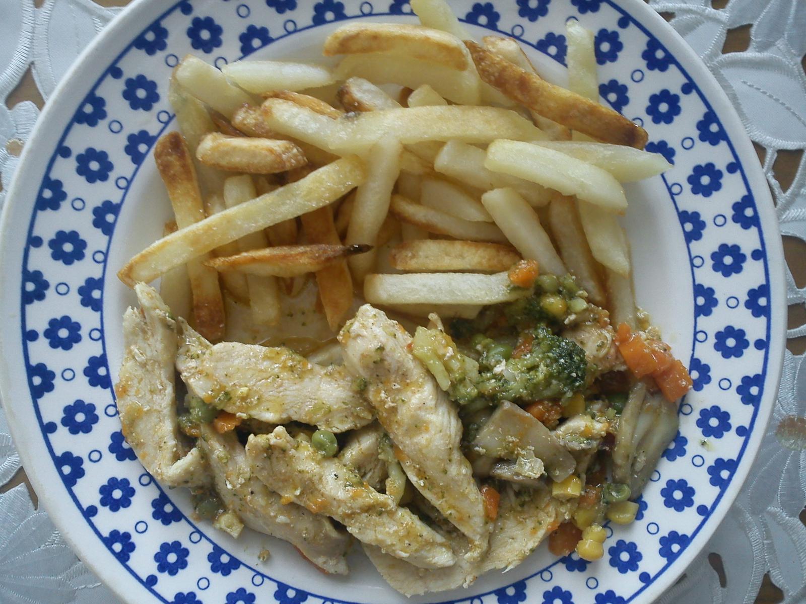 dnes kotletky na cibuľke a slaninke s pečenými zemiakmi a uhorkou 🙂