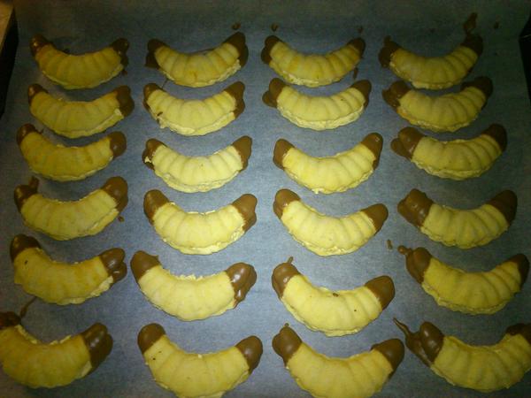 @dana_l myslis k tym rozkom? Ja som urobila take valceky cca 1.5cm priemer,rozkrajala na rovnake kusky 5-7cm a na plechu len ohla do tvaru rohrliku. Pecies na 180 cca 8min.