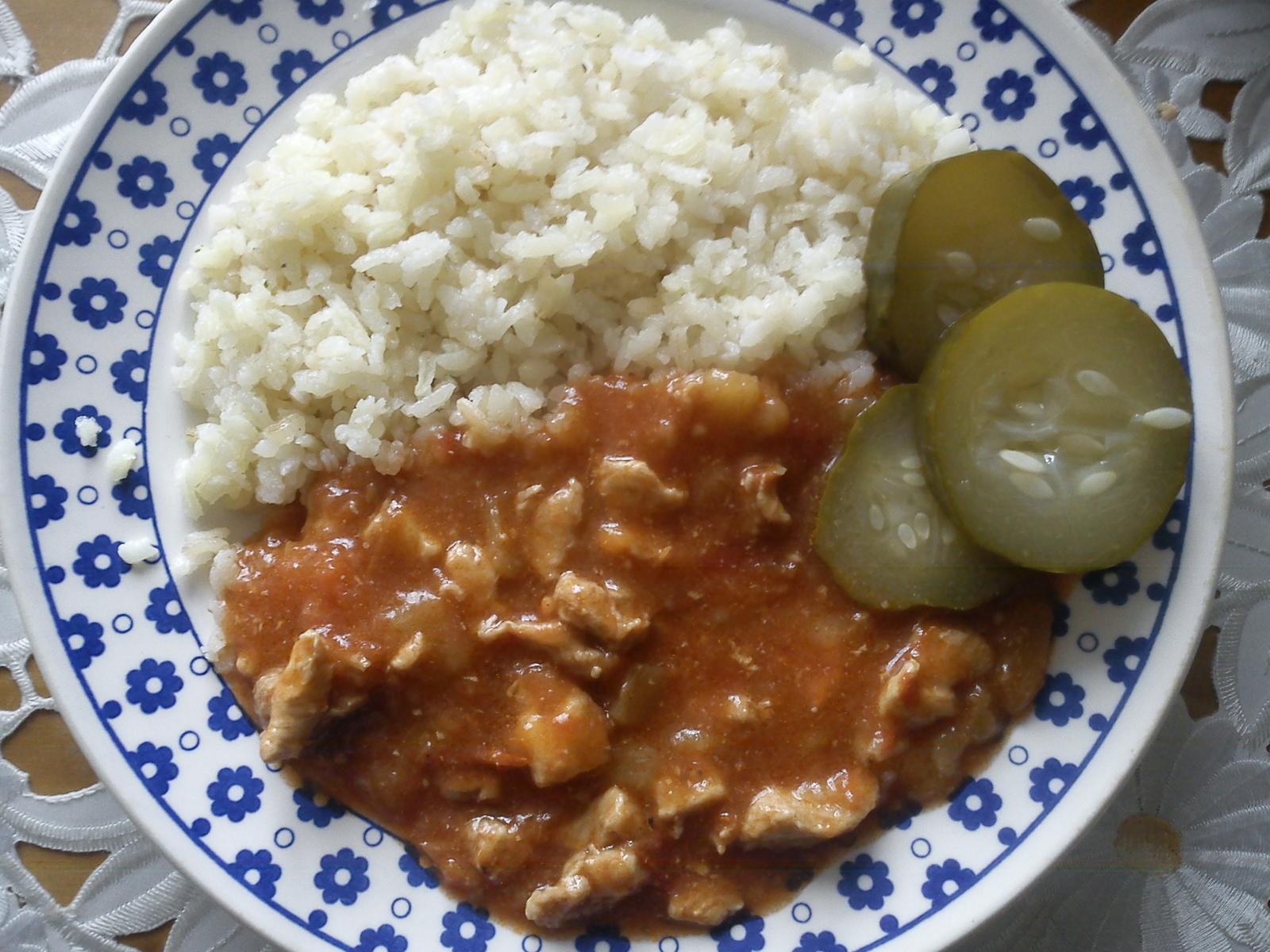 U nás včera a dnes zemiakové guľky s bravčovou náplňu na masle a cibuľke, zeleninková polievka s haluškami a bravčové mäsko s lečom a príloha ryža s uhorkou. 🙂 Po hydine príjemná zmena. 🙂