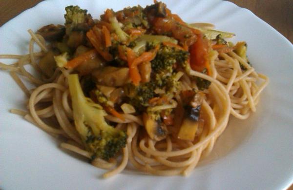 dnes som varila krupičkovú polievku s nastrúhaným kalerábom a rozšľahaným vajíčkom, trojfarebné cestoviny so syrovo-smotanovou omáčkou s brokolicou a údenou krkovičkou pre deti a ja som si robila celozrnné špagety s dusenou zeleninkou (brokolica, mrkva, cibuľka, šampinony, paradajka) a troškou kečupu...musím sa pochváliť , dom nemyslela, že to dokážem..už týžden dom nemala chlieb, ani iné pečivo a nič sladké 🙂 ..snád mi to zostane aj nadalalej 😉