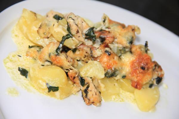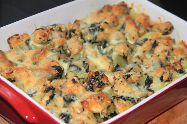 @erina098 kuracie prsia som pokrájala na kocky,posolila, zmiešala s bielým mletým korením,sušenou bazalkou a tymiánom a nechala chvíľu postáť.Medzitým som si očistila zemiaky , pokrájala na kolieska a uvarila. Mäsko som potom opiekla na masle, pridala som asi 4 hrste baby špenátu a 3 pretlačené strúčiky cesnaku a opekala som kým špenát nezmäkol. Uvarené zemiaky som vysypala do zapekacej misky, na ne som rozprestrela mäso so špenátom,posypala strúhaným eidamom a zaliala šľahačkovou smotanou.Zapekala som kým syr nezhnedol. 😉